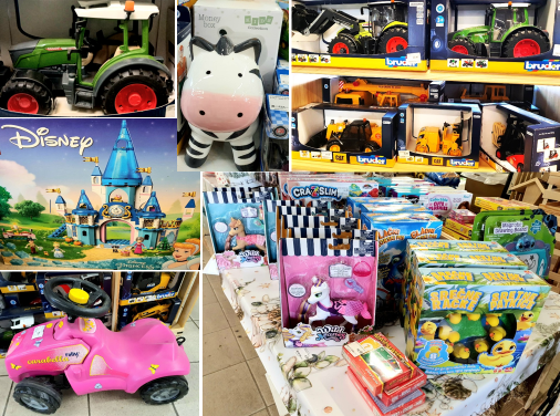 V Kmetijski preskrbi Vojnik lahko dobite tako igrače za dečke in deklice s kmetijsko (traktorje, bagre, tovornjake, prikolice, brana, trosilec itd.) kot nekmetijsko tematiko, družabne in miselne igre, otroška ročna orodja in še mnogo več.